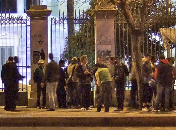 Χθες βράδυ, 1η Δεκέμβρη, ώρα 21.00. Καμιά διακοσαριά ναρκομανείς, αφού εγκατέλειψαν τον πεζόδρομο της Τοσίτσα, περιμένουν χωρίς ντροπές το εμπόρευμα ή τρυπιούνται μπροστά στην είσοδο του Πολυτεχνείου. Ο κόσμος που κατευθύνεται στην μεγάλη στάση του τρόλεϊ βγαίνει στην άσφαλτο για να τους αποφύγει να μπλεχτεί στον συφερτό, μια κοπέλα παραλίγο να χτυπηθεί από διερχόμενο αμάξι.